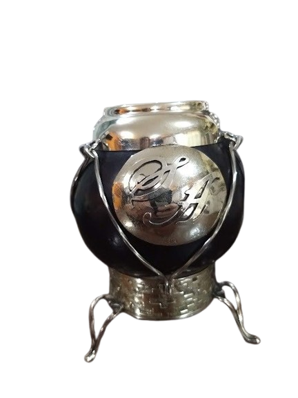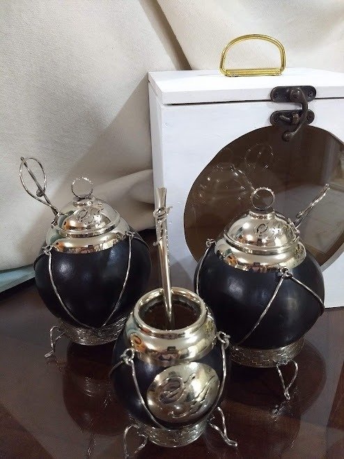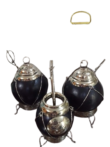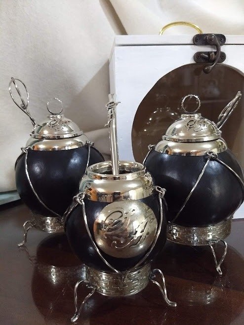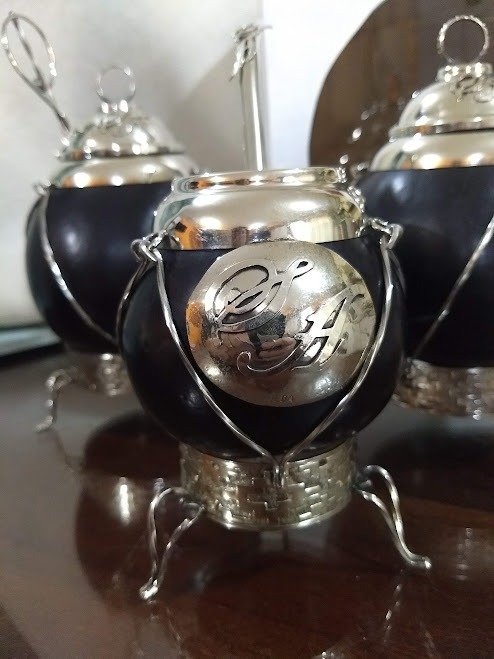 Conjunto matero a pedido, con iniciales caladas a mano en alpaca, con base y patas en alpaca soldado con plata. Consta de mate con bombilla, tapas personalizadas y cucharones. Presentado en caja bolsa.