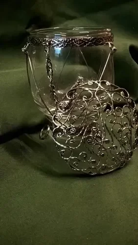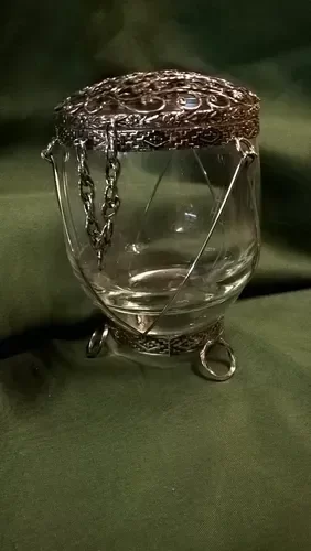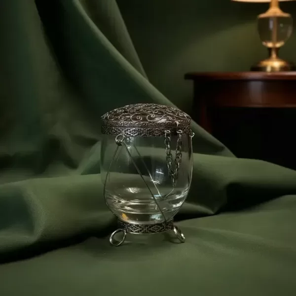Caramelera de vidrio con tapa tipo filigrana hecha a mano, con base y patas en alpaca soldado con plata.