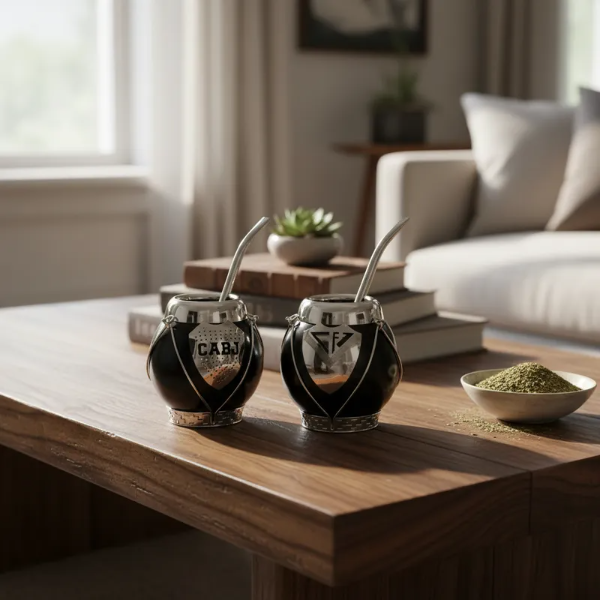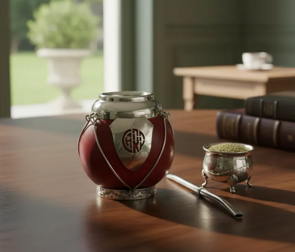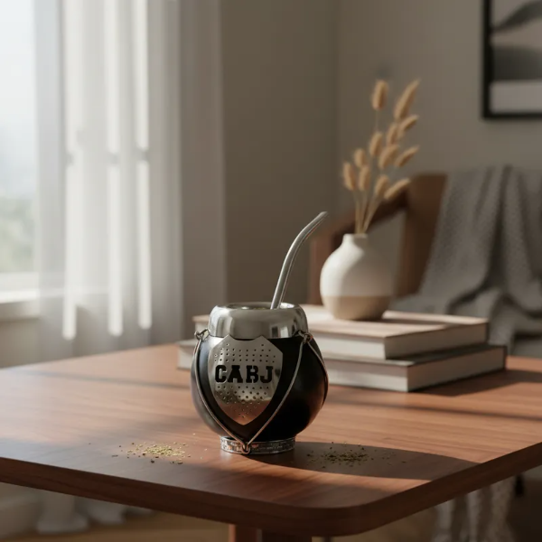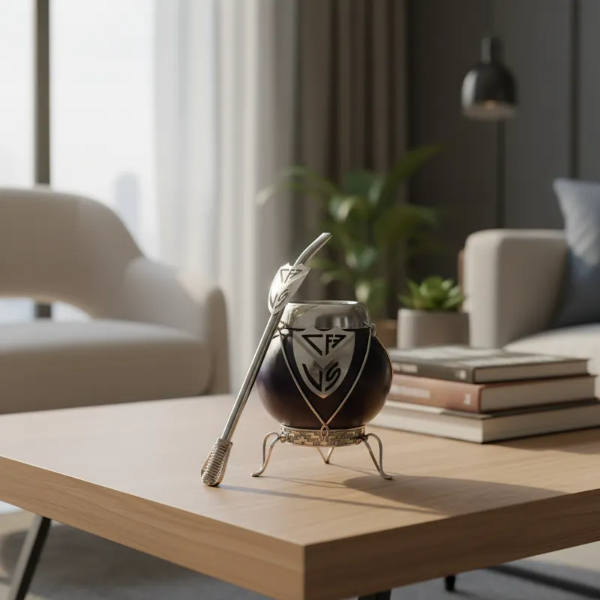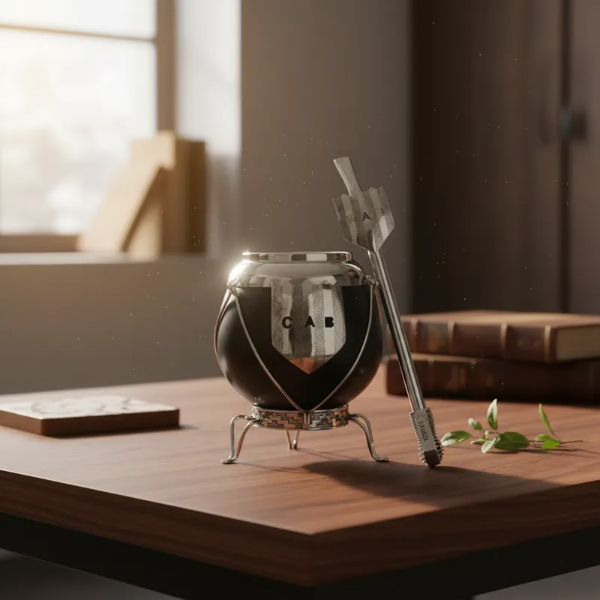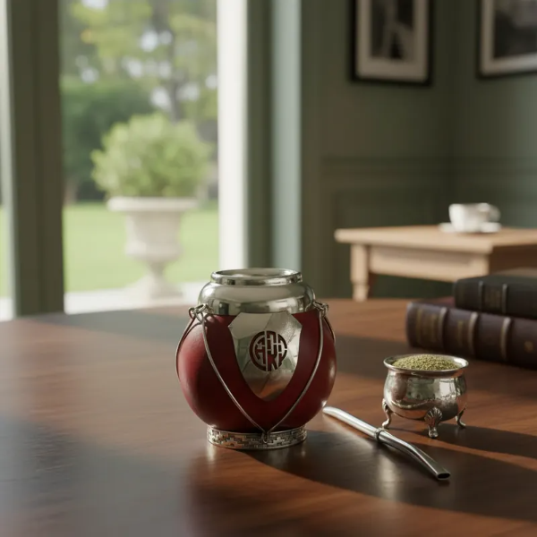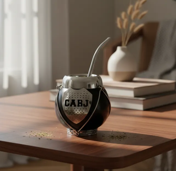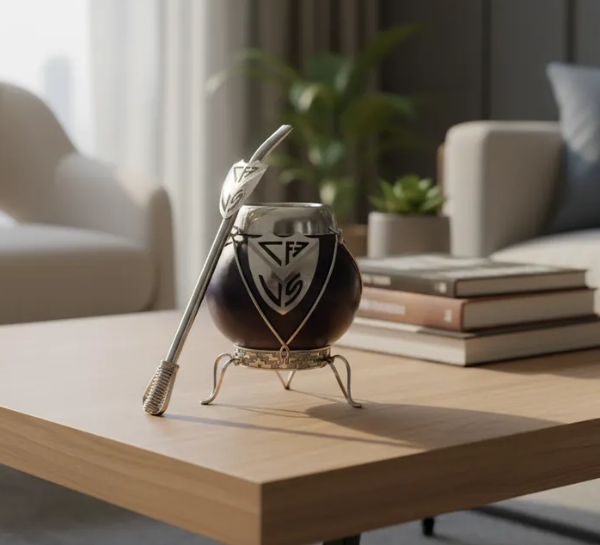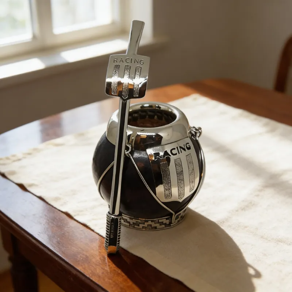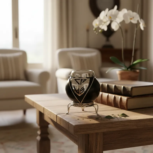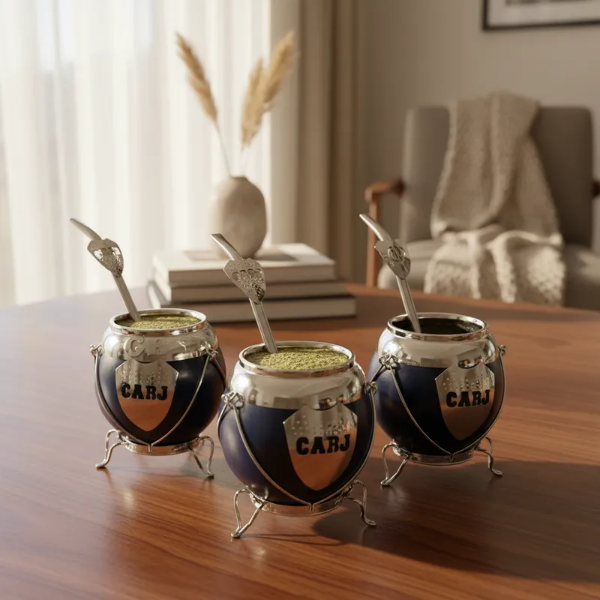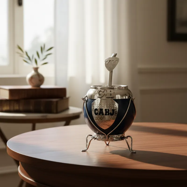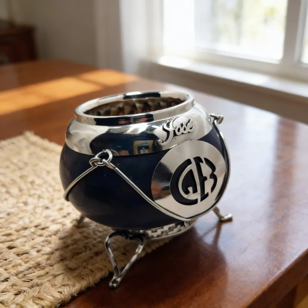 Mate con patas, de calabaza con tu cuadro calado a mano, soldadas con plata, sobre alpaca, acompañada de bombilla( podes poner tus iniciales en la virola), presentado en caja bolsa.