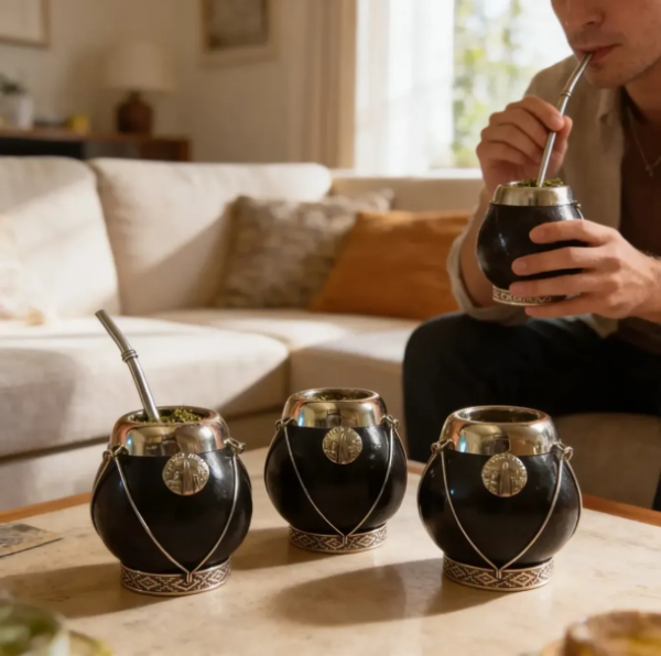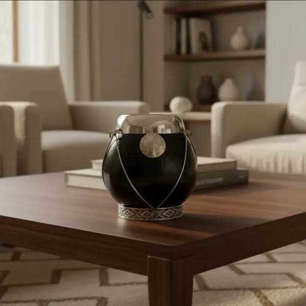 Mate de calabaza con base tipo bombo con dije, soldado con plata. Presentación en caja bolsa. Sin bombilla.