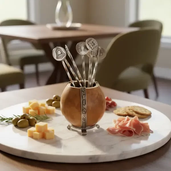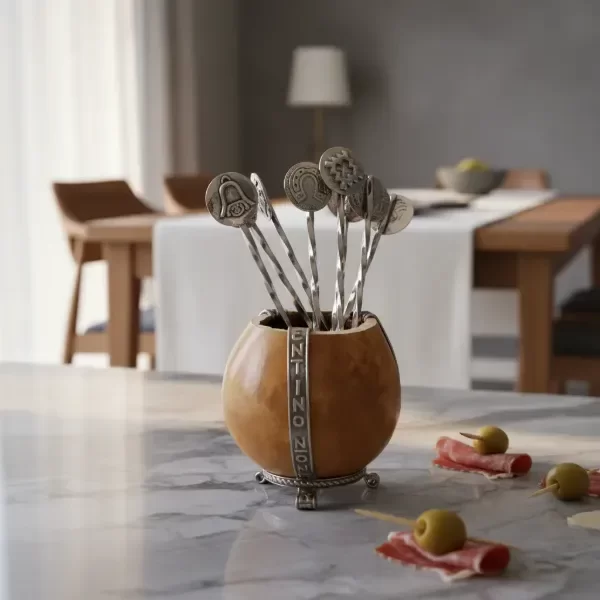 Pinches de picada motivo gauchesco, estampa en alpaca, soldado con plata; en un practico contenedor de calabaza que puede variar según el stock.