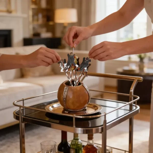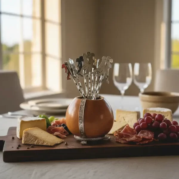 Pinches de picada motivo tango, calados a mano en alpaca, soldado con plata; en un practico contenedor de calabaza que puede variar según el stock.