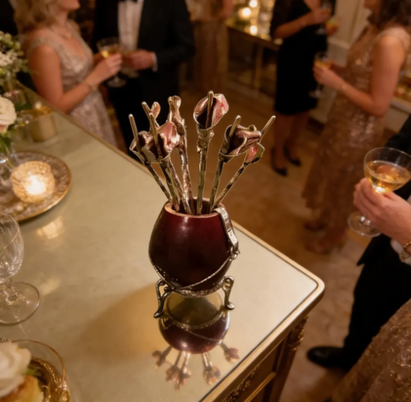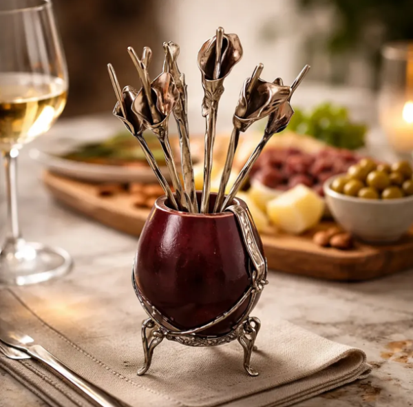 Pinches de picada calas, x 6 unidades hechas a mano en alpaca y bronce, en un practico contenedor de calabaza que puede variar según el stock.